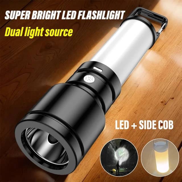Lampe de poche LED rechargeable haute puissance, lampe de camping, lampe de poche avec lumière latérale, étanche, lampe d’extérieur portable avec crochet arrière