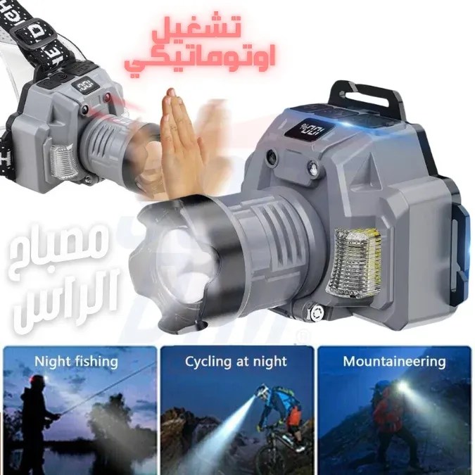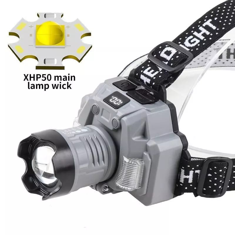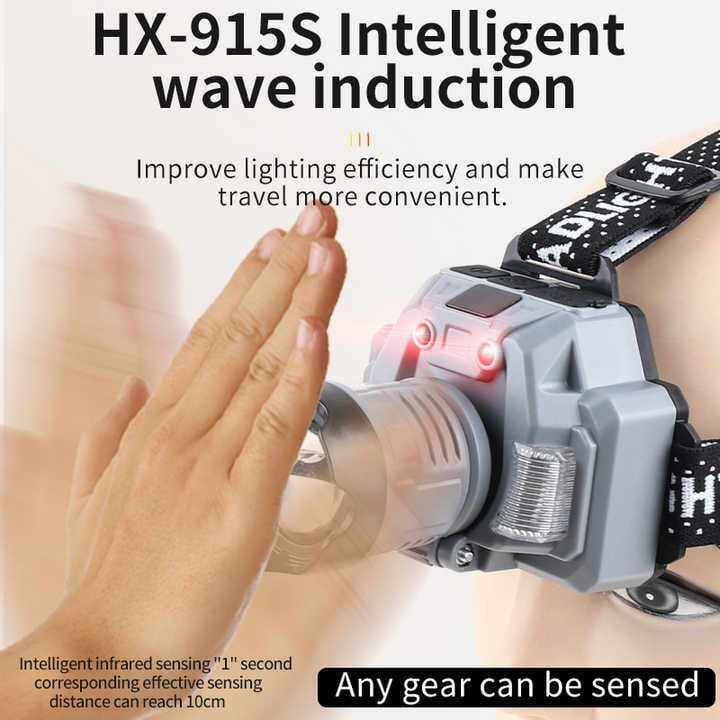 Lampe frontale rechargeable HX-915S avec capteur, zoom 4 niveaux, étanche, idéale pour le camping, la randonnée